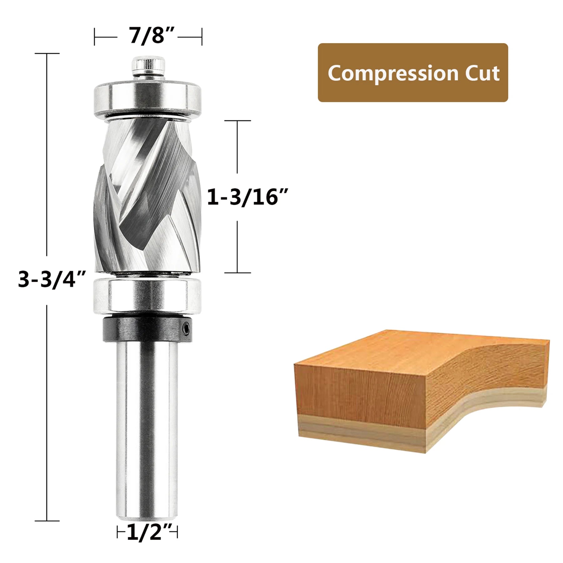 - With top and bottom bearings for a compression cut, you get template routing and flush trimming with crisp edges on both faces, minimizing fraying.